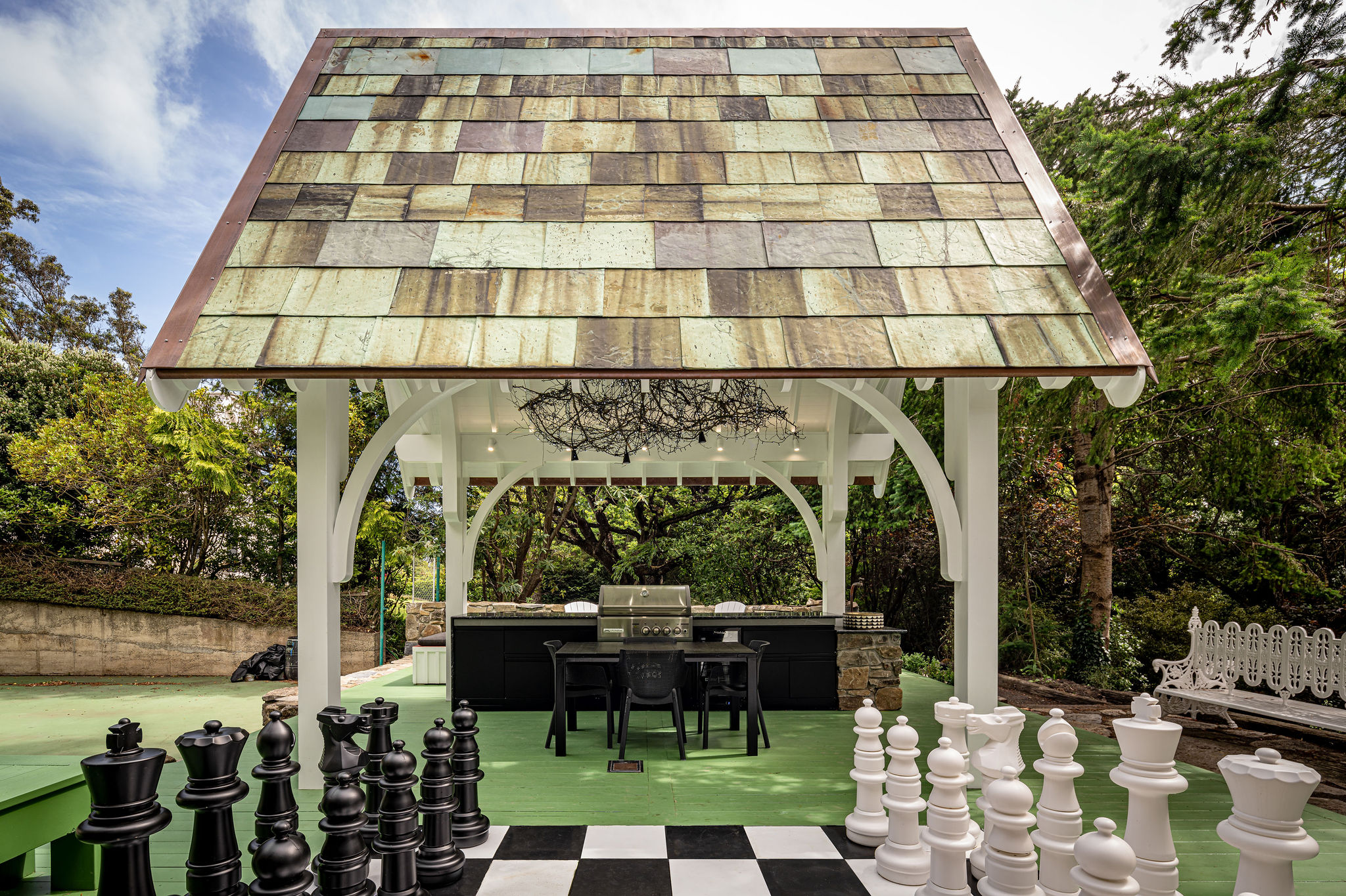 This fully custom made pergola built by Structur Building at the end of a tennis court, features curved beams, a custom built outdoor kitchen using pre-fab units, a large deck and chess court, and a bespoke copper roof using re-claimed tiles off of the Christchurch cathedral.